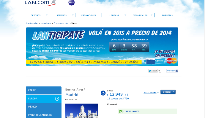 LAN presentó una interesante promoción que incluye pasajes a Caribe, Europa y México: hasta el 7 de diciembre se pueden conseguir pasajes de febrero a junio de 2015 (para Europa son sólo febrero-marzo) con precios "congelados" y hasta en 18 cuotas sin interés con tarjeta de Banco Francés o en 12 cuotas con Mastercard de todos los bancos.