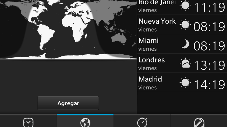 Blackberry Resulta bastante simple. En las últimas versiones, como el BB Z10, sólo hay que ingresar a "reloj" y ahí tocar la opción "reloj mundial". Se pueden agregar ciudades o ver los horarios de las que vienen por defecto. Además, da información sobre la temperatura.