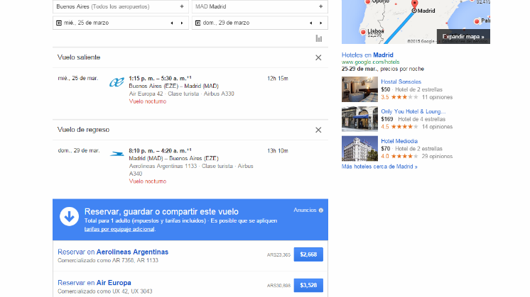Eso sÃ, como todavÃa no vende pasajes, el último paso da la posibilidad de ingresar a la aerolÃnea elegida o de hacer un reserva mediante agentes de viaje. Durante todo el proceso marca el precio en dólares ($), pero en este último paso ya aparece el precio en pesos (se identifica como ARS). Y como todo producto Google que se precie de tal, deja compartir el itinerario con un link corto para mandar por mail, publicar en las redes sociales o guardarlo para recibir ofertas en Google Now.