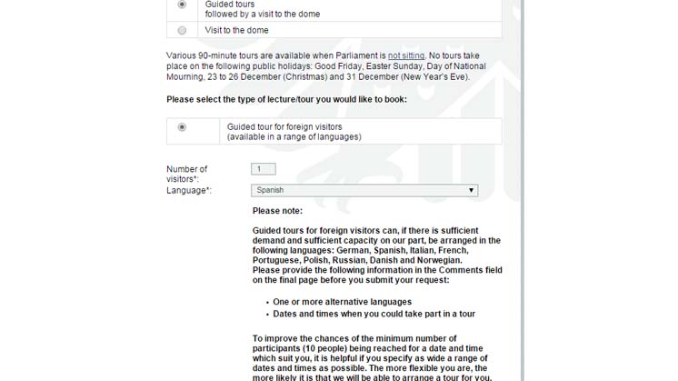 • Primero hay que ingresar al sitio del Bundestag y buscar la opción de 'online registration'. Allí, nos explican lo que siempre suelen explicar en estos casos. Que los campos marcados con un asterisco son obligatorios, que no hay que tocar los botones del navegador de atrás o adelante porque sino perdemos todo lo cargado y qué tipo de visita le gustaría reservar.