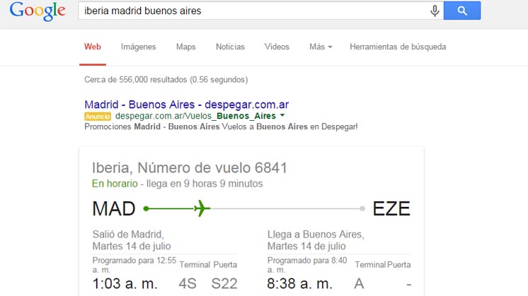 Para esta búsqueda hay que poner la aerolínea + las ciudades. Ejemplo: "Iberia Madrid Buenos Aires". Ofrece el número de vuelo, si está en horario o no, en cuánto llega a destino y hasta las terminales y las puertas de ambos aeropuertos.