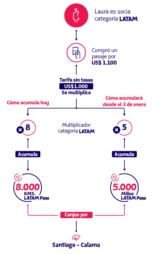 Con el objetivo de entregar mejores opciones de acumulación y canje a sus socios, LATAM Airlines informó la modificación de la moneda de su programa de pasajeros frecuente LATAM Pass, pasando de kilómetros a Millas LATAM Pass. Esta modificación es sólo nominativa, donde 1 Milla LATAM Pass será equivalente a 1,6 KMS. LATAM Pass.