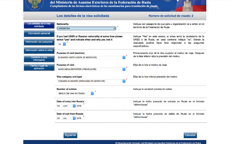 - Hay que ingresar al sitio de visas del Consulado de Rusia en la Argentina. Y elegir país e idioma para continuar con el trámite online (la primera parte del proceso es online y después hay que ir al consulado para un último paso presencial)