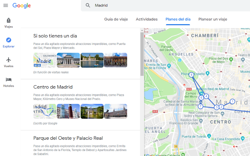 - Planes del día sugeridos. Un repaso de 10 lugares imprescindibles (tomado en función de las visitas reales a esos lugares), un tour local (escrito por el equipo de Google) o de lugares cercanos (escrito también por Google)