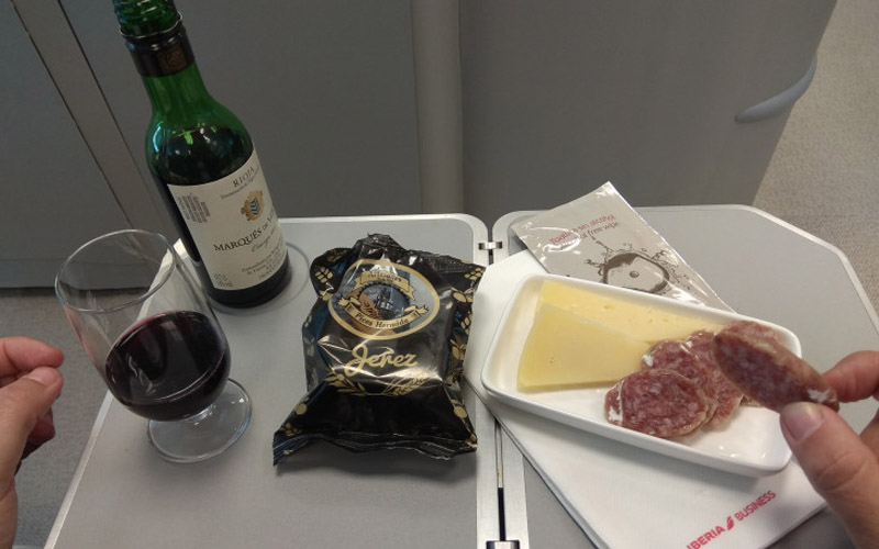 En total son cinco tipos diferentes de tapas (salchichón, chorizo, lomo ibérico, fuet, cecina) acompañados siempre de quesos (manchego, Idiazábal, Mahón, Majorero…), que cambian siempre en los vuelos de ida y regreso a Madrid.