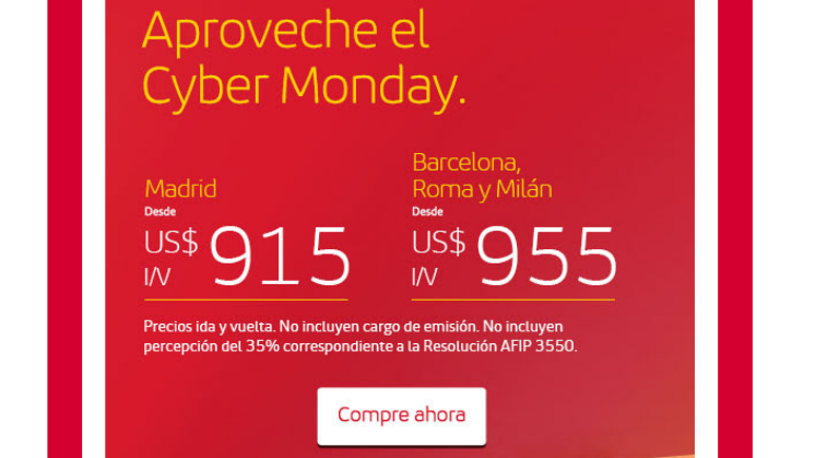 Aunque no forma parte de manera "oficial" del Cyber Monday Argentina 2015 (LAN es la única aerolínea), Iberia lanzó su promoción válida entre el 1 y 3 de noviembre para vuelos a Madrid, Roma, Barcelona y Milán. Las ofertas son para vuelos hasta el 30 de abril de 2016, con regreso hasta el 31 de mayo. Y aunque el precio del banner aparece en dólares y sin el 35% de recargo de AFIP, al ingresar a la web de Iberia se calcula en pesos, con el 35% incluido, con facturación en la Argentina y con la opción de pagar hasta en 12 cuotas con tarjetas Mastercard.